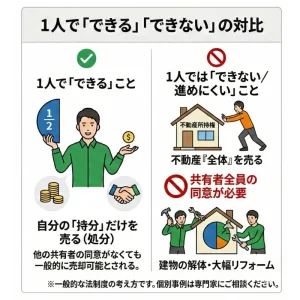 ポイントは、「自分の持分のみの譲渡は原則として可能だが、不動産全体に関わることは一人では決めにくい」ということです。
